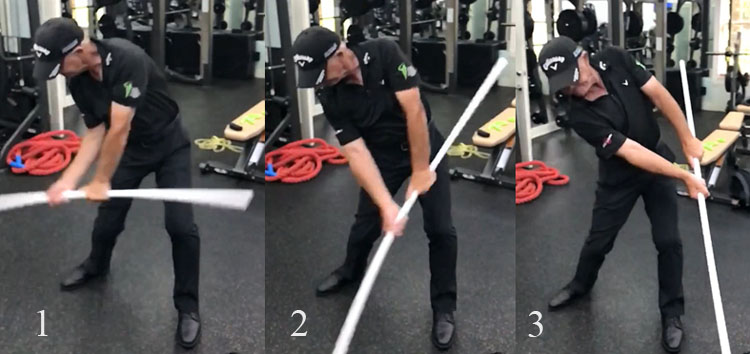 one is pulling the club downwards/groundwards in front of the upper torso.