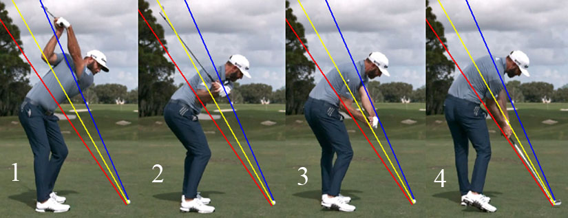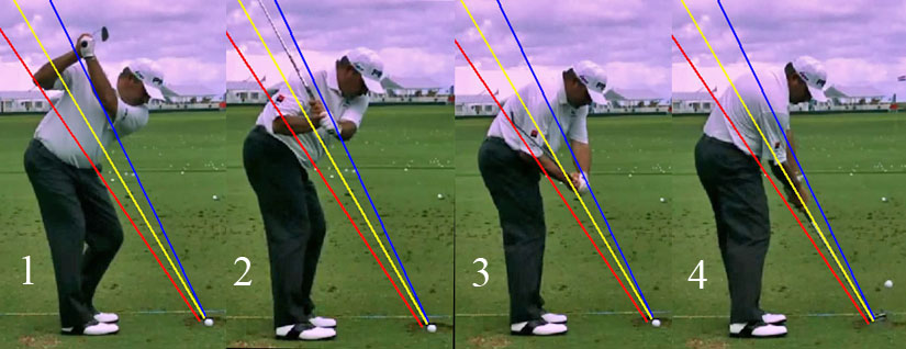 The red planar line is called the hand plane (= his original shaft plane at address). The yellow plane line is the elbow plane and it is drawn through the trail elbow at address. The blue plane line is the turned shoulder plane (TSP) and it is drawn through the trail shoulder socket at the P4 position.