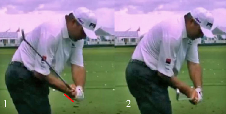 Note that I have drawn a short red line parallel to their clubface, which shows that their clubface is still wide open relative to their clubhead path at ~P5.7. Note that both WZ and SS do not use an artificial clubface-closing technique (eg. reverse motorcycle move) during their early-mid downswing action.