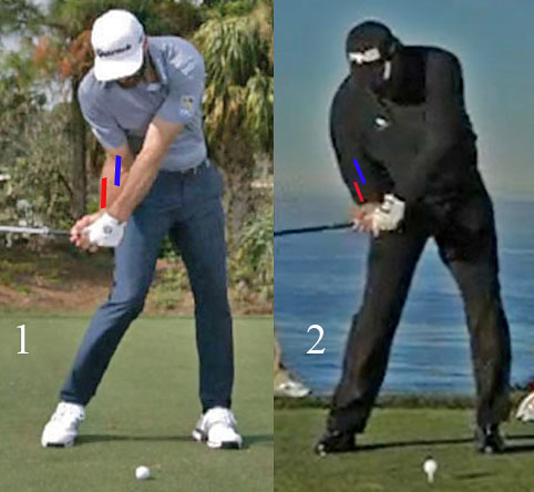 I have drawn a blue line down the middle of their trail antecubital fossa/upper trail forearm and a red line along their trail lower forearm's radial bone, and it shows that both golfers have a supinated trail forearm at their P6 position. DJ's trail forearm appears to be more supinated than AC's trail forearm - for reasons previously explained.