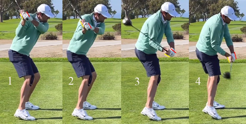 Note that I have drawn a red line parallel to the back of his lead hand. Note that the red line becomes progressively more horizontal between P4.5 => P5.5 and that requires that SS perform a lead forearm pronatory motion in order to shallow his clubshaft during his P4 => P5.5 time period.