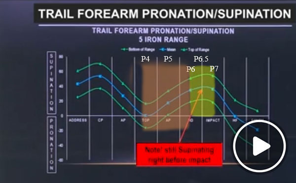Many golf instructors believe that pro golfers use a pronatory motion of their trail forearm between P6 => P7 in order to square the clubface by impact. However, Jon Sinclair's research evidence shows that pro golfers are actually increasing their degree of trail forearm supination between P6 => P6.5, which is not compatible with that "trail forearm clubface-closing" theory. I believe that pro golfers increasingly supinate their trail forearm between P6 => P6.5 before slightly decreasing their degree of trail forearm supination between P6.5 => P7 in order to ensure that their clubshaft remains parallel to the functional swingplane between P6 => P7 and to avoid any tendency to "tumble" their clubshaft over-the-plane during the late downswing between P6 => P7.