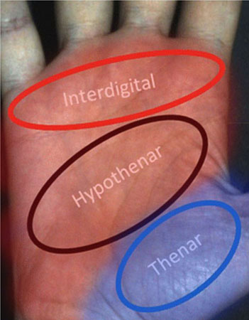The "true" palm area is colored in red and consists of the interdigital area and the hypothenar area.