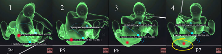 Now, let's consider the 2nd phase of pelvic rotation that happens between P5 => P7. Between P4 => P5 SW's pelvis rotated ~ 45 degrees counterclockwise to become square by P5. Then, between P5 => P7 his pelvis must rotate another 45 degrees counterclockwise if he wants the pelvis to become ~45 degrees open by impact. How is this goal best accomplished from a biomechanical perspective? Look at those capture images above, and note that the lead buttocks has already moved back to reach the tush line by P5. Then, between P5 => P7, the lead buttocks does not move further away from the ball-target line to a significant degree and it mainly moves away from the target as the lead hip joint (red dot) moves further away from the target. What biomechanical actions cause the lead hip joint to rotate further away from the target during the later downswing between P5.5 => P7 when the lead leg is increasingly being pressure-loaded and braced as the golfer progressively straightens his lead leg and elevates his lead pelvis? Because a pro golfer is increasingly bracing his lead leg during the later downswing between P5.5 => P7 as he increasingly straightens his lead leg and elevates his pelvis, it is going to take a lot of muscle force to cause the lead hip joint to continue to rotate counterclockwise under those conditions. I therefore believe that pro golfers most likely use a muscular contraction of their lead gluteus maximus muscle to supply the force need to rotate the lead hip joint area counterclockwise during the later downswing (as seen in those capture images of SW's pelvic motion).