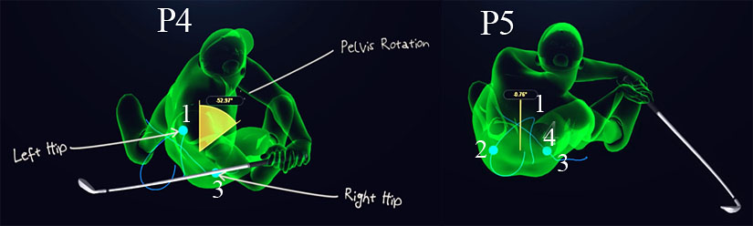 SW is wearing a GEARS-belt during this video lesson that allows one to measure his pelvic motion and knee motion. Swing #1 represents what he calls his usual "on course" golf swing action and at the 4:35 minute time point of the video one can see that he has 48 degrees of clockwise pelvic rotation at P4 while his trail femur/knee has rotated ~31 degrees clockwise and that allows him to drive his trail hip joint into a condition of internal rotation by P4, which is desirable if one wants to optimally pre-stretch the trail-sided lateral pelvic rotator muscles. At the 5:13 minute time point of the video, note that he has rotated his pelvis counterclockwise by 23 degrees by P6, but his trail femur/knee has rotated 34 degrees by P6 (which is undesirable). Impact is at the 5:15 minute time point of the video, where his pelvis is open by 32 degrees while his trail femur/knee has rotated 54 degrees, which means that his trail hip joint is undesirably moving towards a greater degree of internal rotation. Also, note that his trail femur/knee is 38 degrees open at impact, which means that his lead hip joint is not internally rotated at impact.