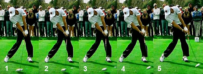 Image 1 is at impact and image 5 is at P8. Note how Dustin Johnson uses a CF-arm release action where his left arm and left hand move more targetwards, and only slightly inside-left, during his followthrough action, and they do not move more around his body along an inner circle path (that is very characteristic of the CP-arm release action used in a RIT release action).