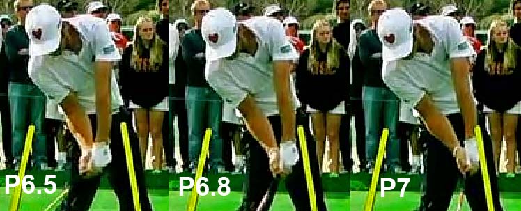 These three capture images show Dustin Johnson performing his right forearm paddlewheeeling action (biomechanically involving the combination of right arm straightening and right forearm pronation) that allows him to synergistically use his right forearm in order to help him to efficiently release PA#3 in his late downswing (evidenced by the counterclockwise rotation of the glove logo on the back of his left hand between P6.5 and P7). Note that his right forearm is frankly supinated at P6.5 (where his right palm is under the club handle and facing skywards) and that his right forearm is neutral at impact (where his right palm is behind the club handle and facing the target), which means that he is pronating his right forearm a lot between P6.5 and P7 (impact) - and that should theoretically not happen in a RIT release action. Also, note that his right elbow is positioned well in front of his right hip area in a pitch elbow location, and it is not positioned alongside his right shirt seam (and behind his right hip area) as seen in a prototypical RIT golfer who uses a punch elbow motion. Finally, note that he is not continuously rotating his pelvis/mid-torso counterclockwise between P6.5 and impact, while continuously keeping the right elbow positioned behind the right hip area - as Jim Hardy recommends for a RIT golfer.