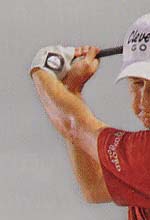 Starting with the face-on view, note that the clubshaft is at right angles to the left arm. This cocking-up of the left wrist during the mid-portion of the backswing is often referred to as "setting the wrists". Setting of the wrists usually begins when the hands reach the right trouser pocket in the takeaway, and many golf instructors (such as David Leadbetter) believe that it is advantageous to complete the "setting of the wrists" by the time the left arm has reached the horizontal position in the backswing (9 o'clock position), although other golf instructors favor a delayed setting of the wrists. At the three quarter position, when the clubshaft is fully set in a vertically upright position, it will feel "light" in the hands. For the club to be angled at 90 degrees to the left arm at this stage of the backswing - the left wrist has to cock upwards while the right wrist bends back (dorsiflexes) and the right elbow bends.