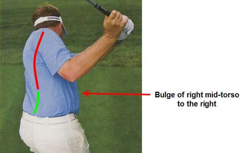 I think that one characteristic sign of this S&T spine "arch-extension maneuver" is the fact that the right side of the mid-torso appears to be bulging slightly to the right - thereby obliterating part of the "space" that is created by a traditional/conventional golfer who performs a rightwards-centralised backswing pelvic action.Addendum added December 2010: