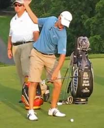 Note that Aaron Baddeley's hands are outside his right foot, and in line with his toes. In the address position, the hands were a few inches in front of the toe-line. So, did he pull his hands inwards during the takeaway to get to this position? The answer is "no". The hands get to this marginally inside position (relative to their position at address) as a result of the shoulder rotation. Note that the left shoulder has moved down towards the ball-target line, while the right shoulder has moved back (towards the tush-line). That small degree of rotation of the shoulders around the bent-over spine causes the hands to move slightly inwards. There should be no deliberate attempt to move the hands inwards during the initial takeaway by keeping the left arm glued to the chest wall. That will cause the hands to move too far inside during the takeaway, and the hands will end up behind the toe line by the end-takeaway position. The key thought, in the takeaway, is to rotate the shoulders (turn the shoulders perpendicularly around the spine) while simultaneously thinking of moving the back of the right hand straight back (away from the target). A golfer should imagine that there is a baseball catcher standing directly behind him, and he should think that he is trying to place the clubhead in the catcher's mitt - by simultaneously i) rotating, and not tilting, the shoulders and ii) moving the hands straight back. Of course, the hands do not actually move straight back, because of the rotation of the shoulders around the bent-over spine, and the hands should slightly inside and "correctly" end up over the toe-line by the end of the takeaway.