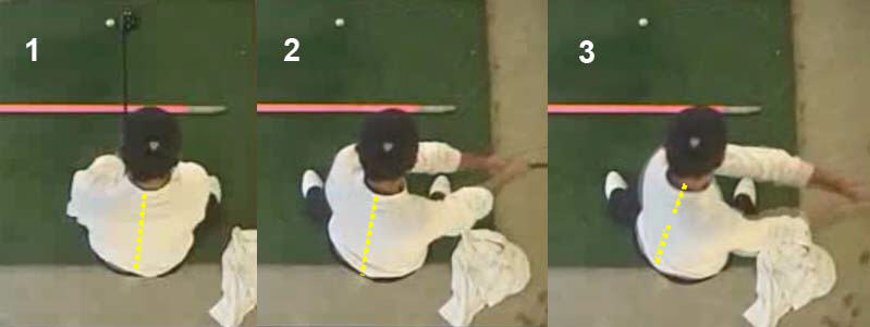 Image 1 shows a Slicefixer student at address. Note his rightwards-tilted spine.Image 2 shows how he simply rotates his upper torso around his rightwards-tilted spine during the mid-backswing. Note that he doesn't sway his head and upper torso to the right.